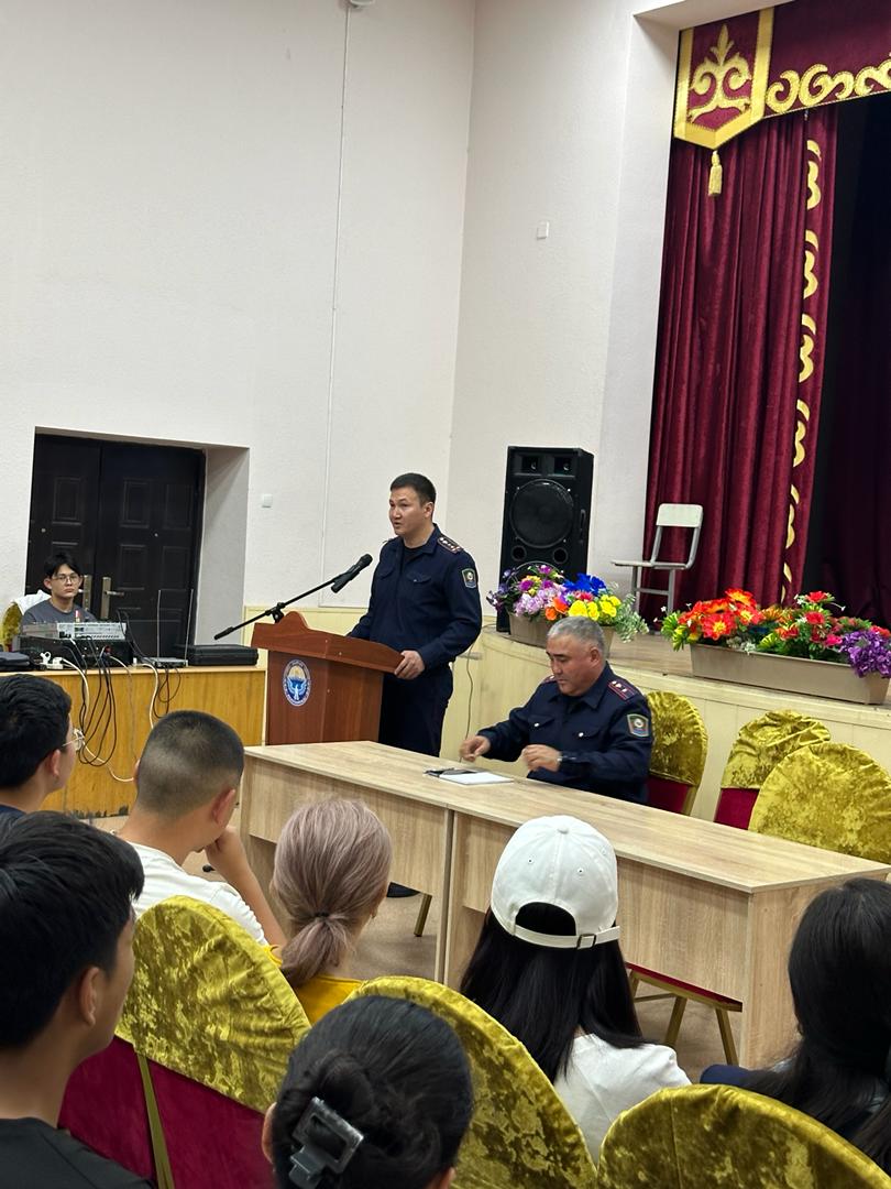 2024-жылдын 7-майында окуу жайыбызда студенттер үчүн “Жаштар арасында кылмыштуулукту алдын алуу, зордук-зомбулукту болтурбоо, тамеки, ичимдиктердин зыяндуулугу” деген темада иш-чара уюштурулду. Иш- чарага Бишкек шаарынын жаш өспүрүмдөр боюнча Биринчи май райондук ички иштер башкармалыгынын башчысы милициянын майору Жапаров М. К., тергөө бөлүмүнүн тергөөчүсү Асанбаев А., инспекторлор Акылбеков М. жана Дүйшөналиев Э. катышышты.